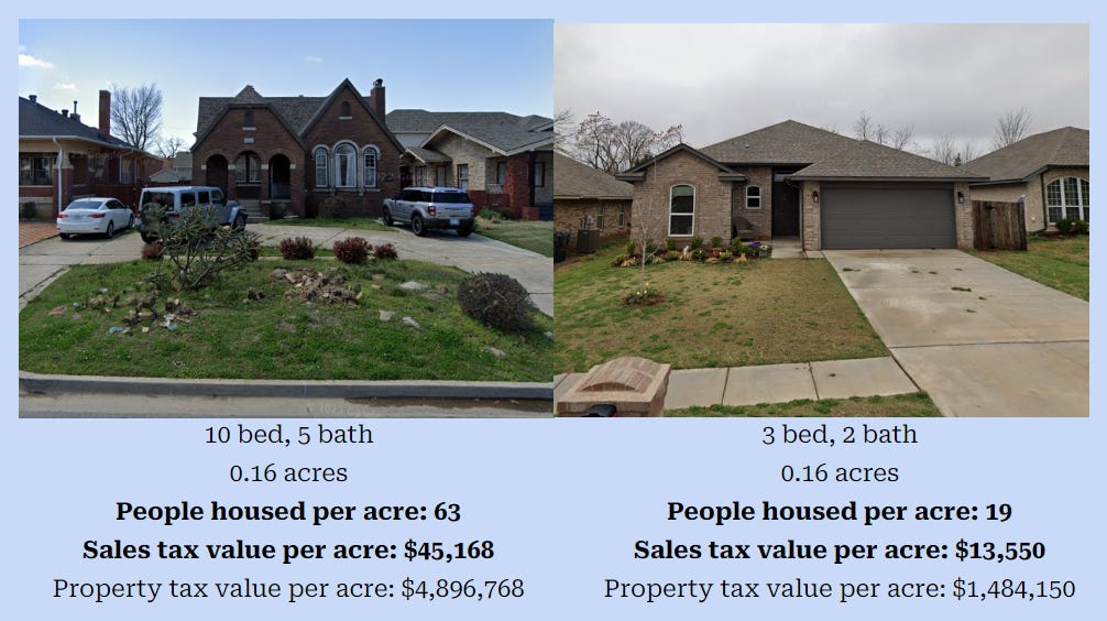724 Jenkins shows us the value of legalizing Accessory Dwelling Units, and other ways to create gentle, incremental density. The type of density that doesn’t radically change the character of a historic and charming neighborhood in core Norman. It really doesn’t take much to create more productive places. That is, places that contribute more to Norman’s long-term fiscal sustainability. This property is doing more to help with our housing affordability problem than any other new suburban home on the fringes of Norman, and this 0.16 acre lot produces three times the revenue for the city than the more suburban 0.16 acre lot. With a limited city budget, complaints about the lack of sidewalks, crumbling streets and bursting waterlines, this is something small we can do to help with those problems. Increasing density is good for our economy.